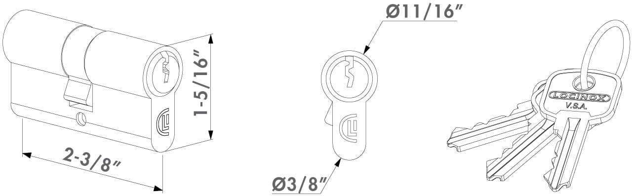 Europrofile cylinder with three keys: 60 mm (2-3/8″), keyed alike or keyed to differ.